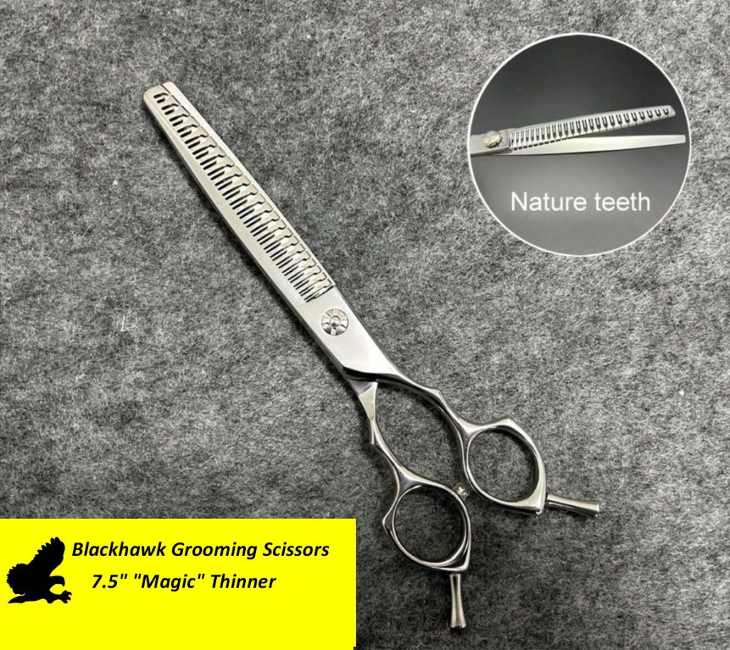 7.5” Japanese 440C “Magic” thinning scissor. Removal rate approx. 10-15% This thinner is sheer magic, suitable for all coat types. Smooth and efficient, leaves no marks or lines on the coat. In all, a fabulous finishing thinner.