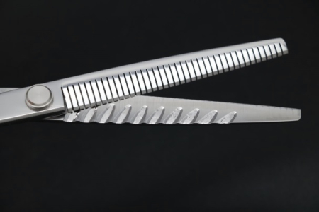 7.5” J440C , the very latest design in thinning blades. This design makes thinning and blending so much easier, with less hair clogging up the teeth. Super smooth action with rotary adjuster.